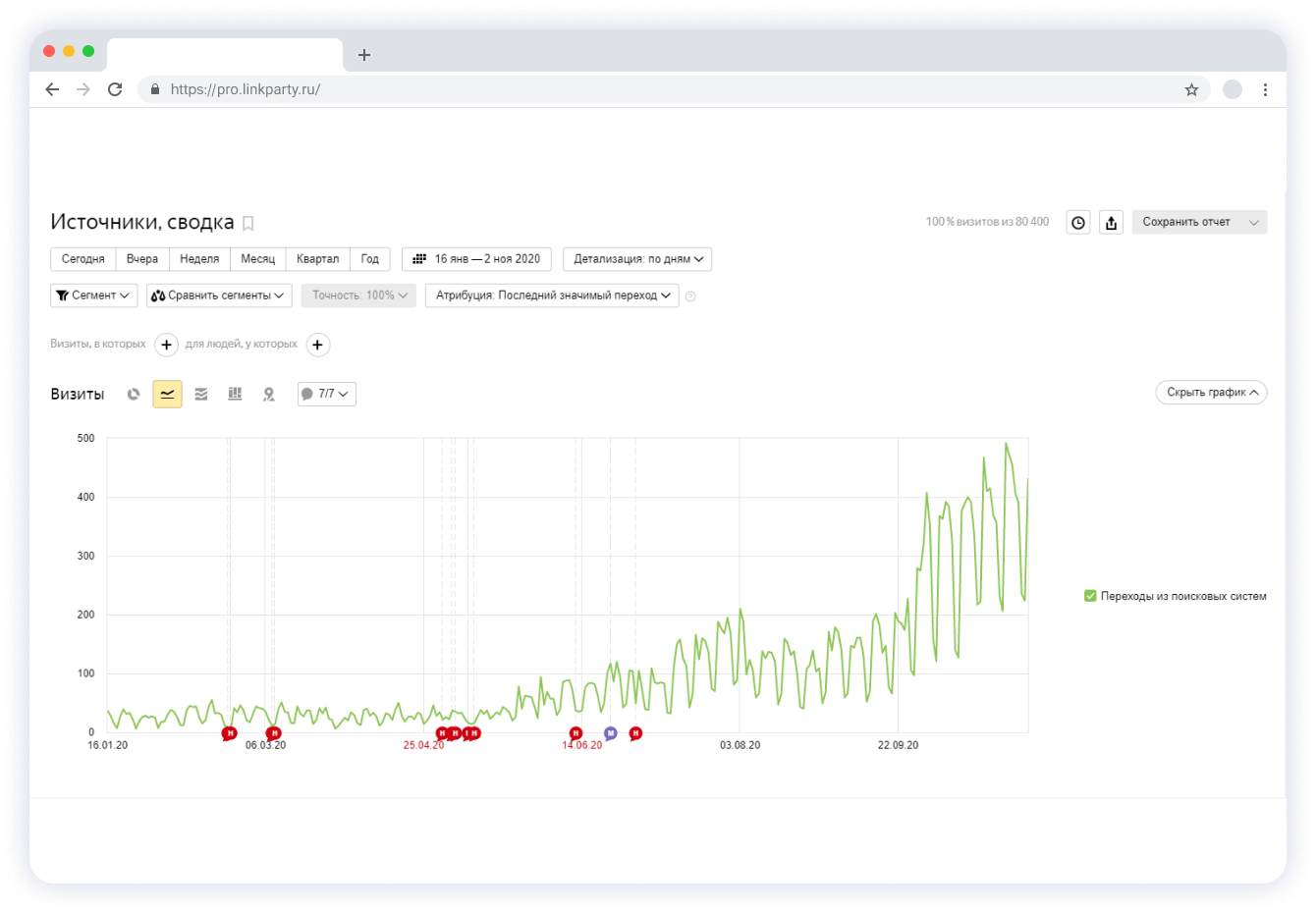 Была составлена ссылочная стратегия на основе конкурентов. Куплено за весь период 70 контекстных ссылок, 180 крауд-ссылок и отзывов. За весь период на ссылки потрачено 1 300 дол.